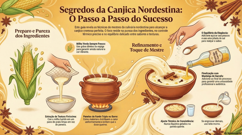 O equilíbrio entre o doce e o salgado define a elegância do paladar. Adicione o açúcar aos poucos e prove a mistura durante o processo de fervura. Da mesma forma, nunca esqueça da pitada de sal para abrir as papilas gustativas. De fato, a canjica cremosa nordestina não deve ser enjoativa, mas sim um convite à próxima colherada. Por fim, a manteiga de garrafa adicionada ao final confere uma untuosidade profissional.