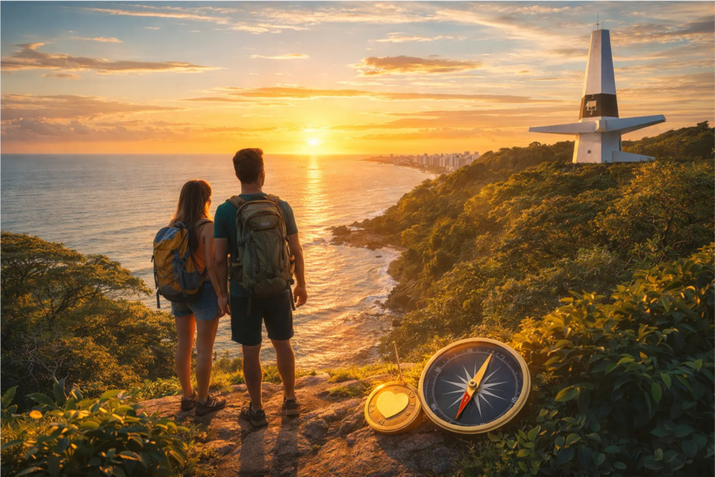 Esta ilustração sintetiza a jornada pelo custo de vida em João Pessoa, mostrando o equilíbrio entre a estratégia financeira (a moeda e a bússola) e a felicidade de viver em um lugar onde a natureza e a modernidade se encontram.