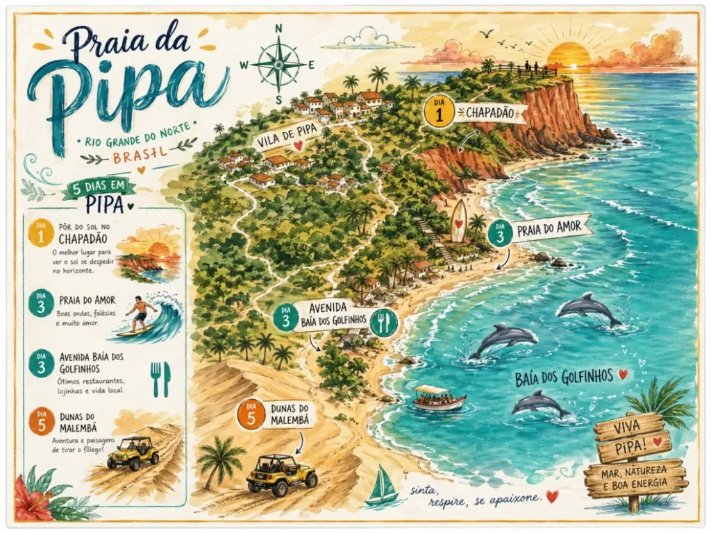 A Praia da Pipa oferece tantas opções que um planejamento bem estruturado faz toda a diferença para sua diversão. Se você possui apenas um dia, foque no essencial: manhã na Baía dos Golfinhos e entardecer no Chapadão. Contudo, para sentir a verdadeira alma da vila, recomendo pelo menos três dias de imersão total no local. Nesse sentido, você conseguirá equilibrar o descanso nas areias brancas com a agitada vida noturna local.