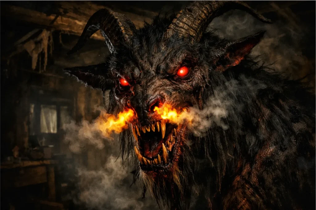 A aparência física dessa criatura desperta arrepios em qualquer pessoa que ouça sua descrição detalhada. Em suma, a Cabra Cabriola é um monstro híbrido que possui dentes afiados e olhos que brilham na escuridão. Além disso, ela solta fogo pelas ventas e possui um cheiro insuportável de enxofre pelo corpo. Certamente, essa combinação de traços animalescos cria uma imagem de puro terror para quem acredita na lenda.